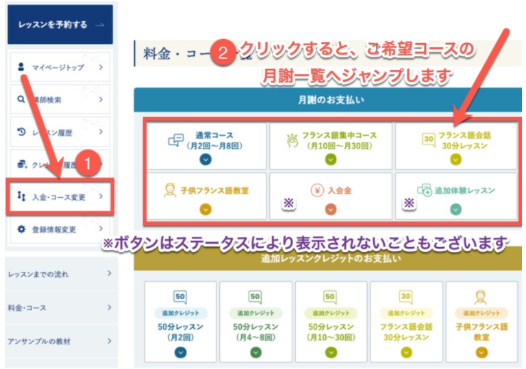 -マイページ>「入金・コース変更」>新たなコースの「購入へ」ボタンをクリック