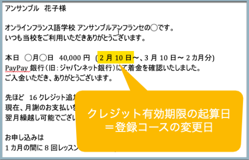 「入金予定日」から2営業日早い日程である「振込期日」までにご入金いただきますが、「クレジット換算」の算定、ならびに「マイページ等に記載のコース表示変更」は入会・再入会時の初回入金日で固定された「入金予定日」に実行されます。「入金予定日」を確認したい場合は、振込期日をお知らせする当校のリマインドメールをご覧ください。本ページ【1】もあわせてご確認くださいませ。