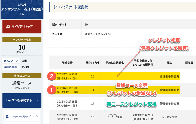 ※2) コース変更日までに現行コースのクレジットを消化することが出来ない場合、残存するクレジットは全て「期限切れクレジット」として[クレジット繰越制度]の対象となります。その一方で、変更内容により「クレジット換算」が実行され、保有クレジット数が減算されることがあります。またこの際、減算に必要な数のクレジットが不足する場合に限り「予約済みで履行を待たれているレッスン」が、システム管理者によりキャンセルされる可能性がございます。本件含む「クレジット換算」の詳細は、本ページの「【4】レッスンクレジットの価値が高くなる場合のコース変更(月8回→月2回など)」欄をご確認ください。